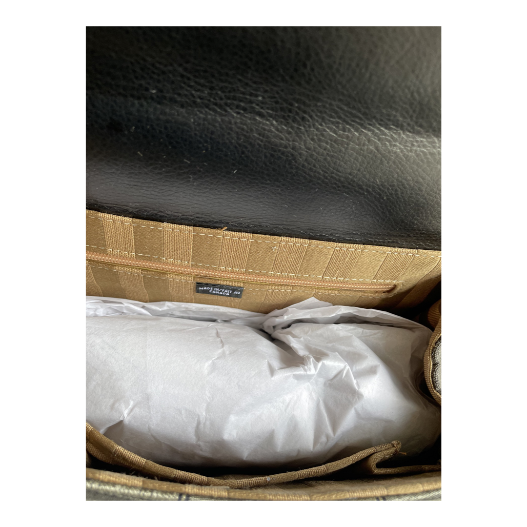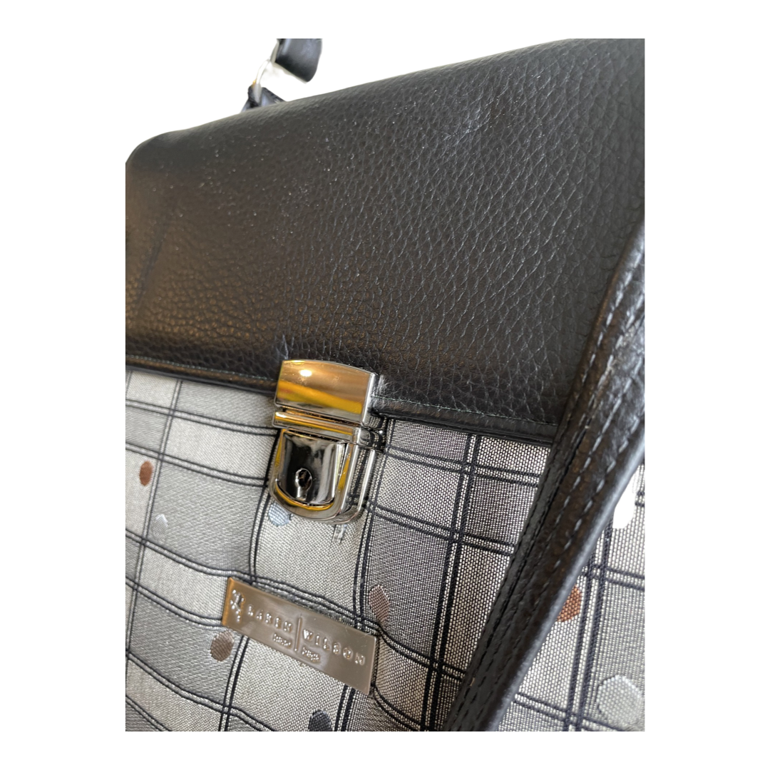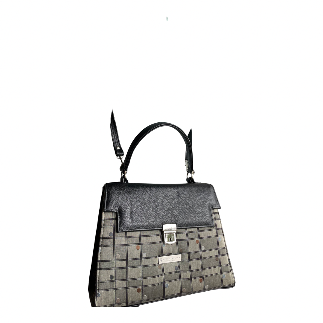 A large Kelly Bag in a gray graphic upholstery fabric with a black leather flap and a polished nickel lock